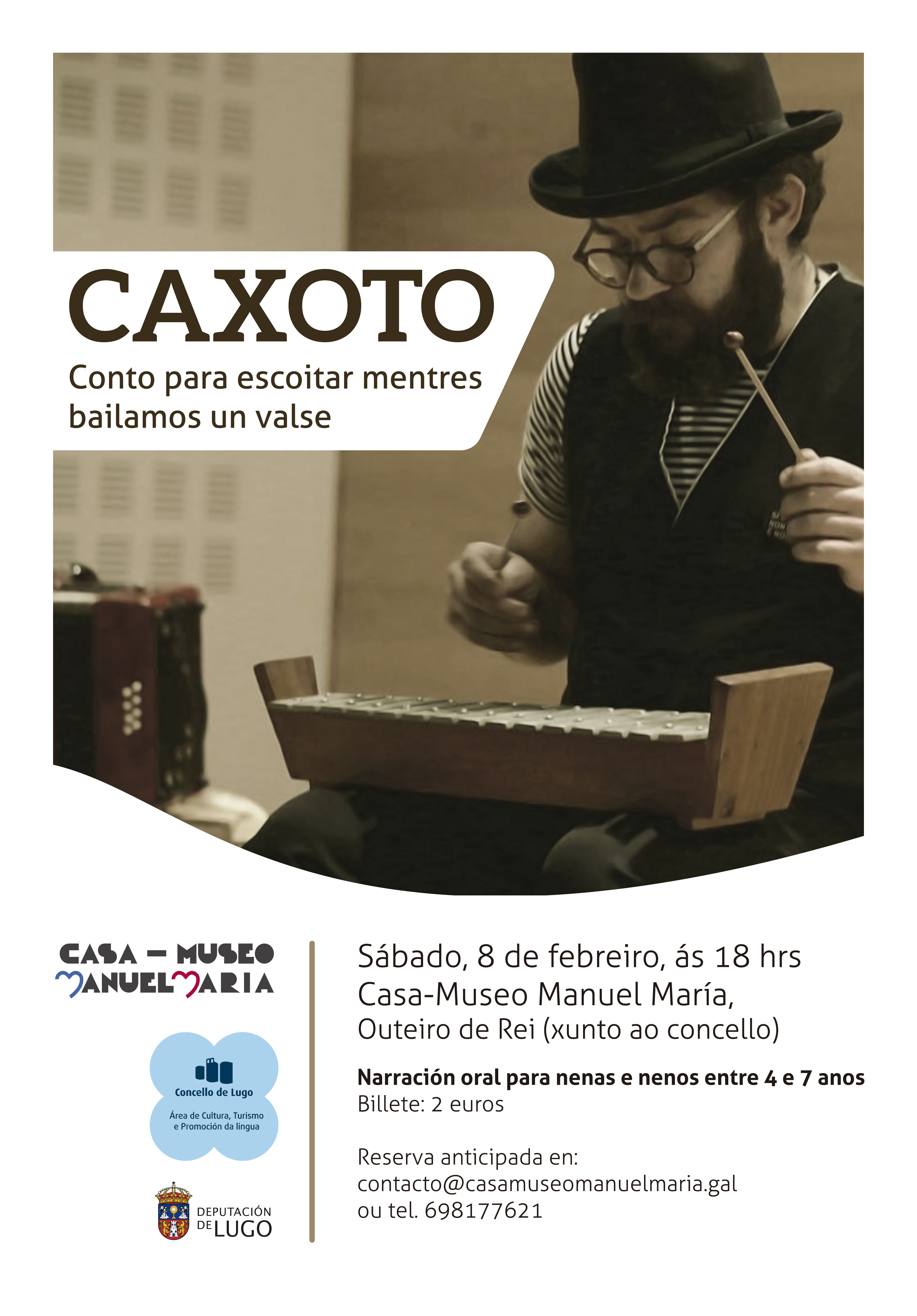 Este sábado, 8 de febreiro, ás 18 hrs, o narrador Caxoto, a través do manexo dos máis insólitos instrumentos musicais, contará, na Casa-Museo Manuel María, a orixe da paixón de Sabela pola música. A actividade vai dirixida para nenas entre 4 e 7 anos. O billete ten un prezo de 2 euros e pode reservarse en contacto@casamuseomanuelmaria.gal
