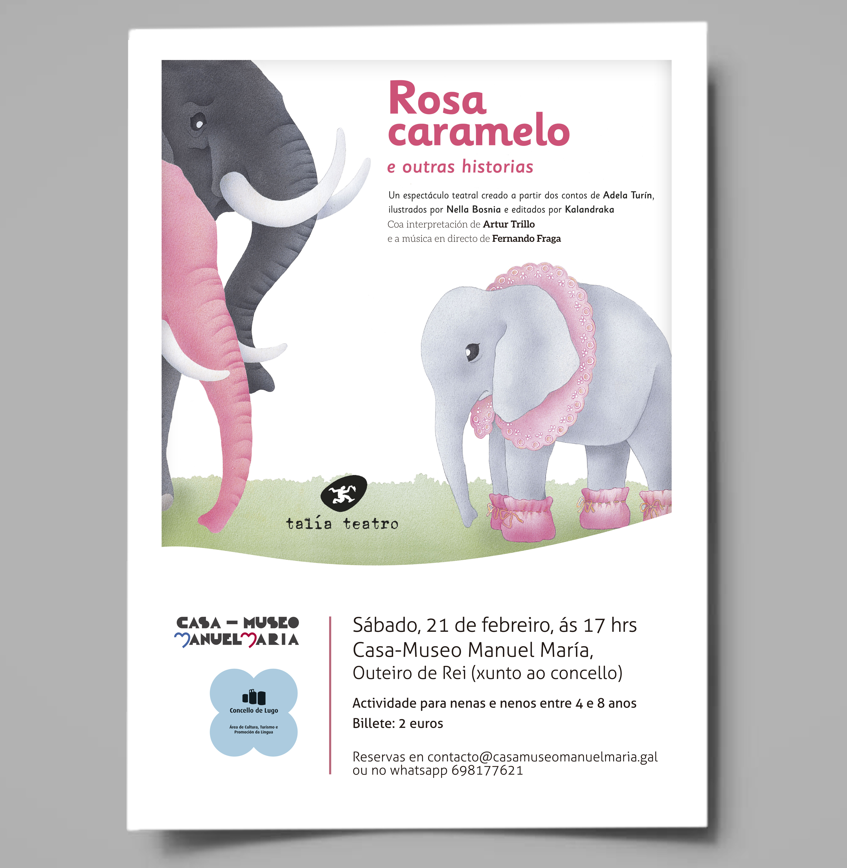 O espectáculo, programado para as 17 horas, vai dirixido para nenas e nenos de catro a oito anos e as súas familias. Para asistir é necesario reservar (billete 2 euros) en contacto@casamuseomanuelmaria.gal ou no whatsapp 698177621