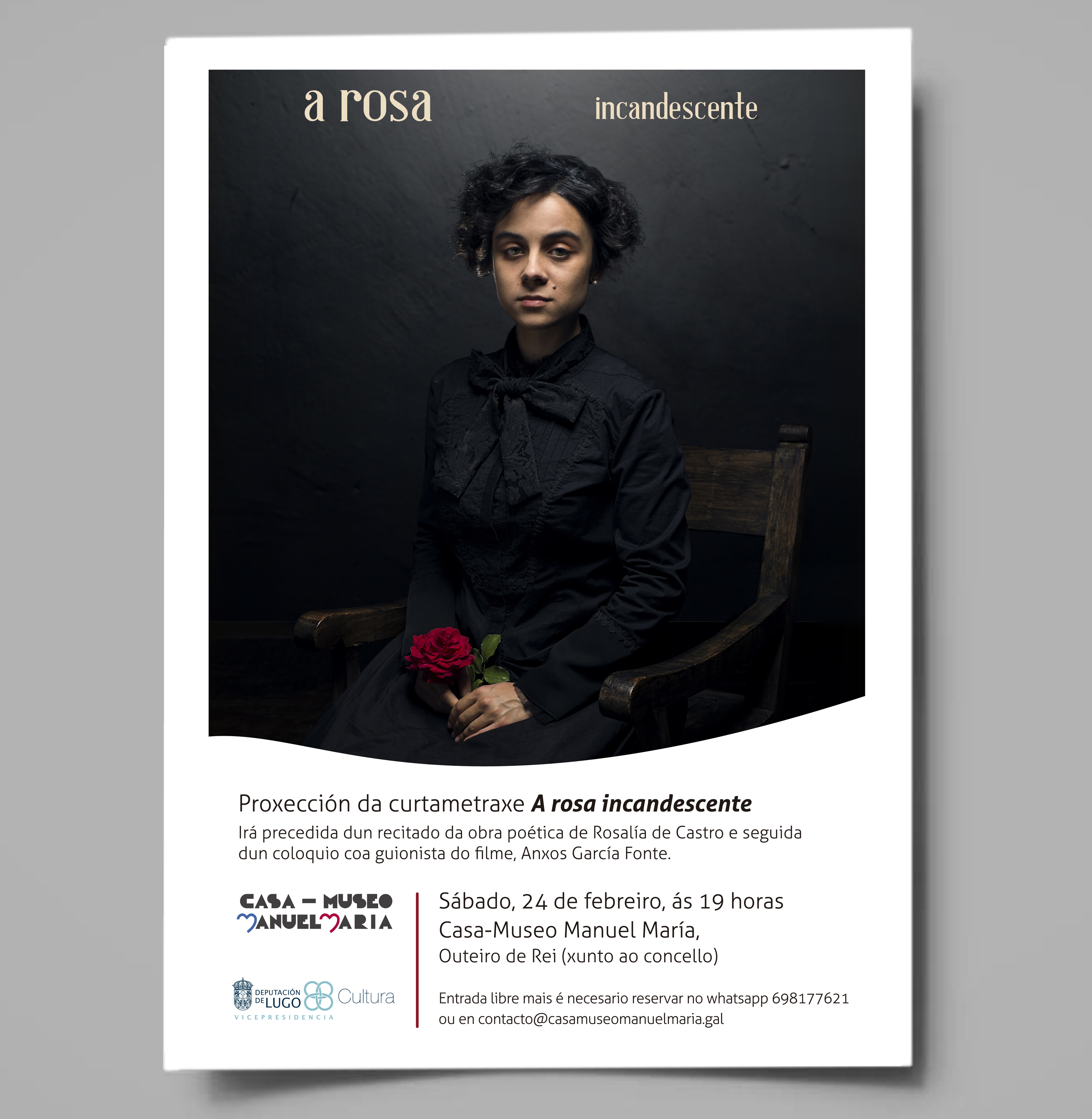 -Proxección de A ROSA INCANDESCENTE. Curtametraxe de 27 minutos, dirixida por David Vázquez, con guión de Anxos García Fonte e protagonizada por Alba López. Este filme vainos achegar unha Rosalía de Castro cercana e directa que nos conta ela mesma algúns dos aspectos fundamentais da súa obra. Rosalía é a mesma rosa incandescente de intelixencia, sensibilidade e paixón polo que fai.
